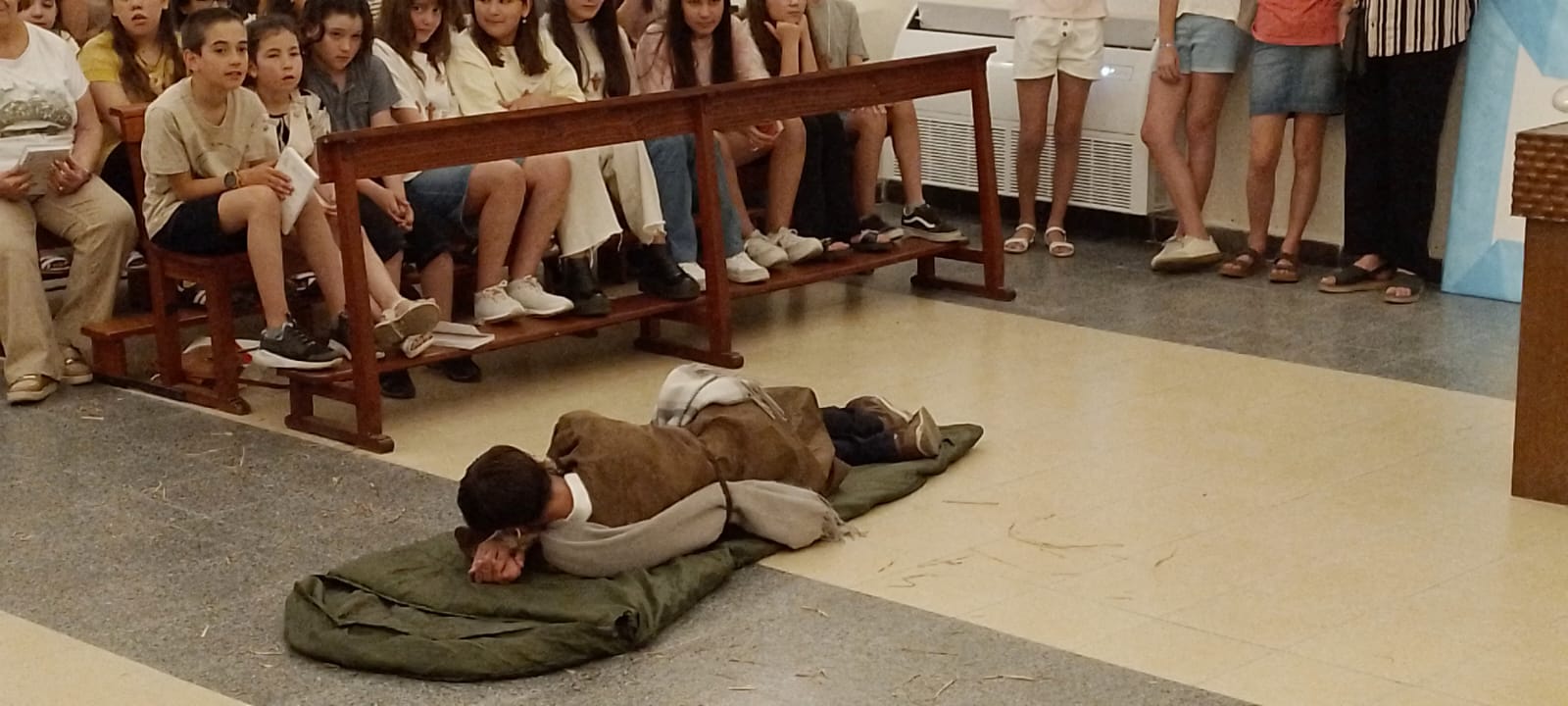 Los niños de catequesis encarnaron los capítulos 1 y 2 del evangelio de San Lucas en el cierre de los encuentros 2025. También el párroco, P. Luis, bendijo e impuso crucifijos.