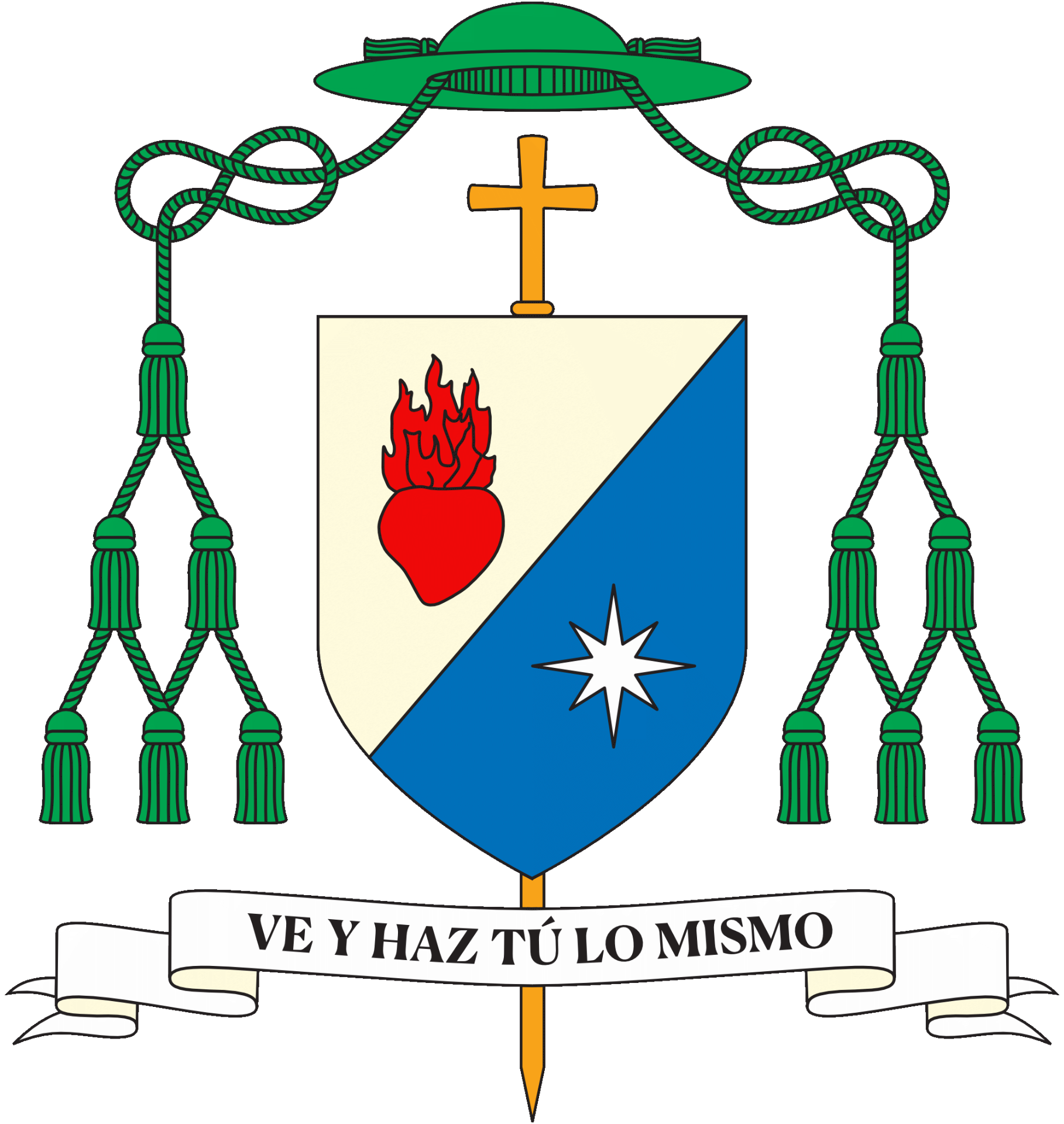 En la parte inferior, una filacteria desplegada lleva el lema pastoral: «Ve y haz tú lo mismo» (Lc 10,37b). El versículo se enmarca en la parábola del Buen Samaritano, donde Jesús le dice al maestro de la ley: «Ve y haz tú lo mismo» (Lc 10,37b). Jesús mismo se nos presenta como ese Buen Samaritano que cuida de nuestra persona, se conmueve, se acerca y venda las heridas del corazón, para que podamos amarlo a Él y servirlo en el hermano, en la hermana. Quienes han sido cuidados por el Samaritano quedan habilitados para recorrer su mismo camino, cuidando del prójimo, amándolo como y porque Él nos ha amado. Este «cuidar» es la misión de la Iglesia, que continúa la del Samaritano, y nos invita a ponernos en camino («ve») y cumplir su misma misión («haz tú lo mismo»).
