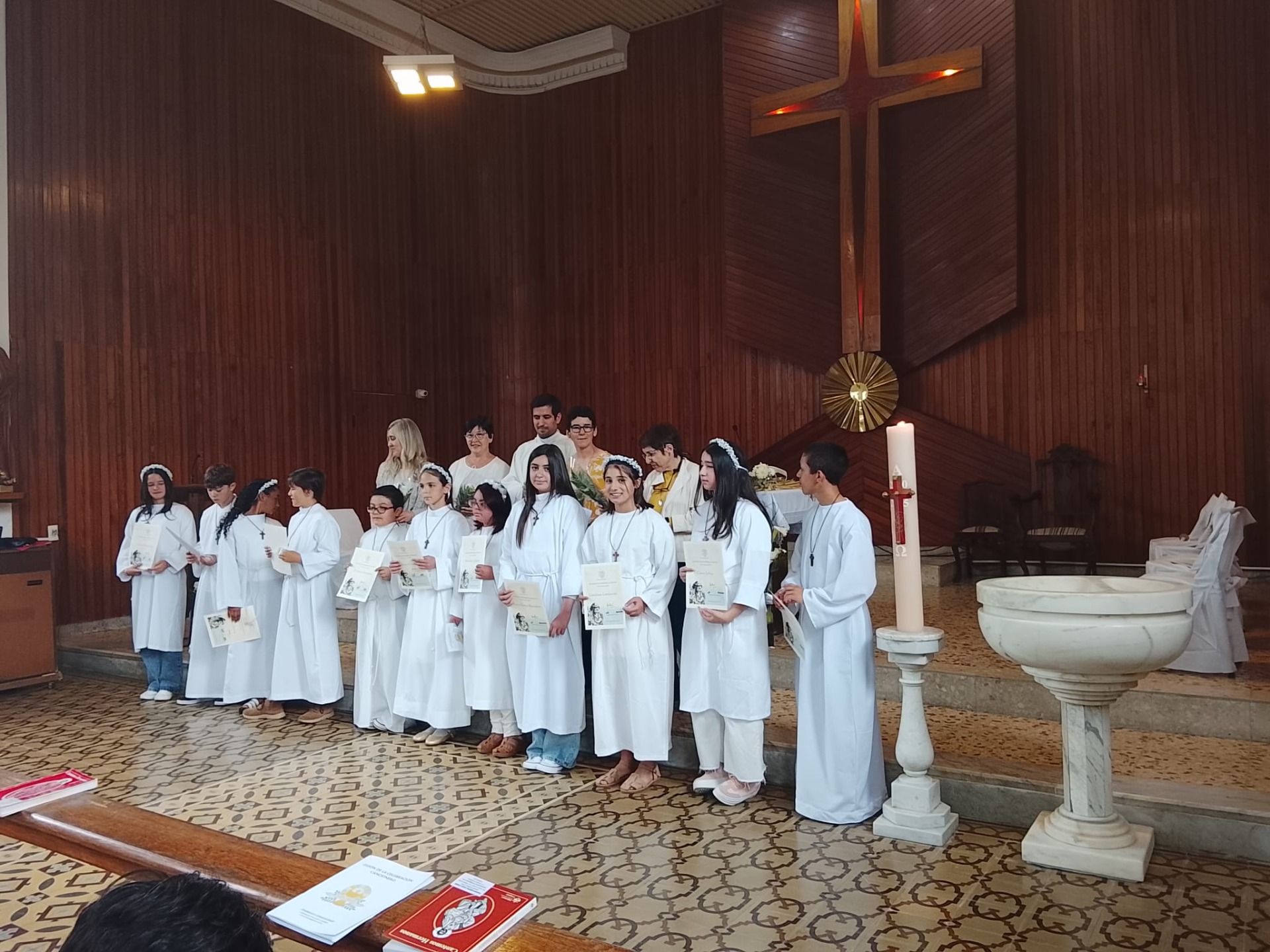 Este grupo de niños tomó la Primera Comunión el Domingo. Acompañados por sus catequistas, familias y la comunidad vivieron el encuentro con Jesús con gran emoción. Rezamos por su perseverancia en el seguimiento de Cristo.